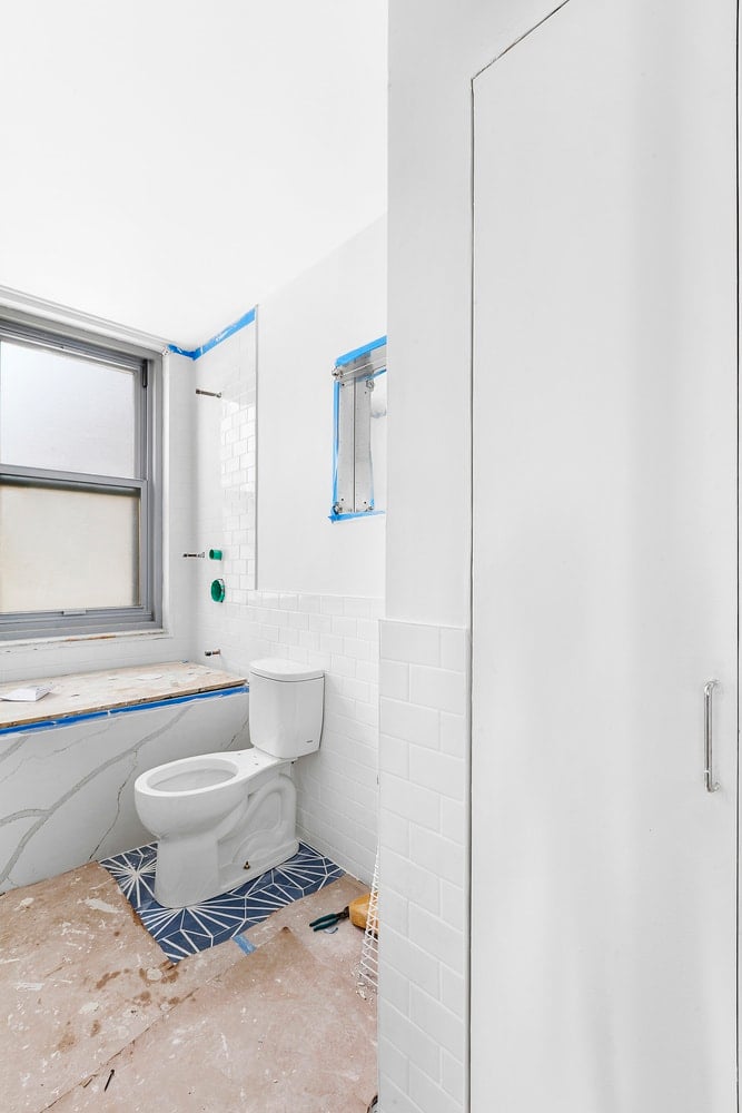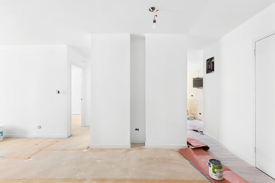 The contractor's complete renovation plan detailing all work being performed is available upon request, with highlights including washer/dryer installation, new bathroom, new kitchen, and new floors throughout. New white oak floors are already installed and can be seen in the photos where the protective paper covering is peeled back.