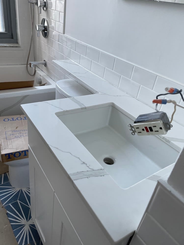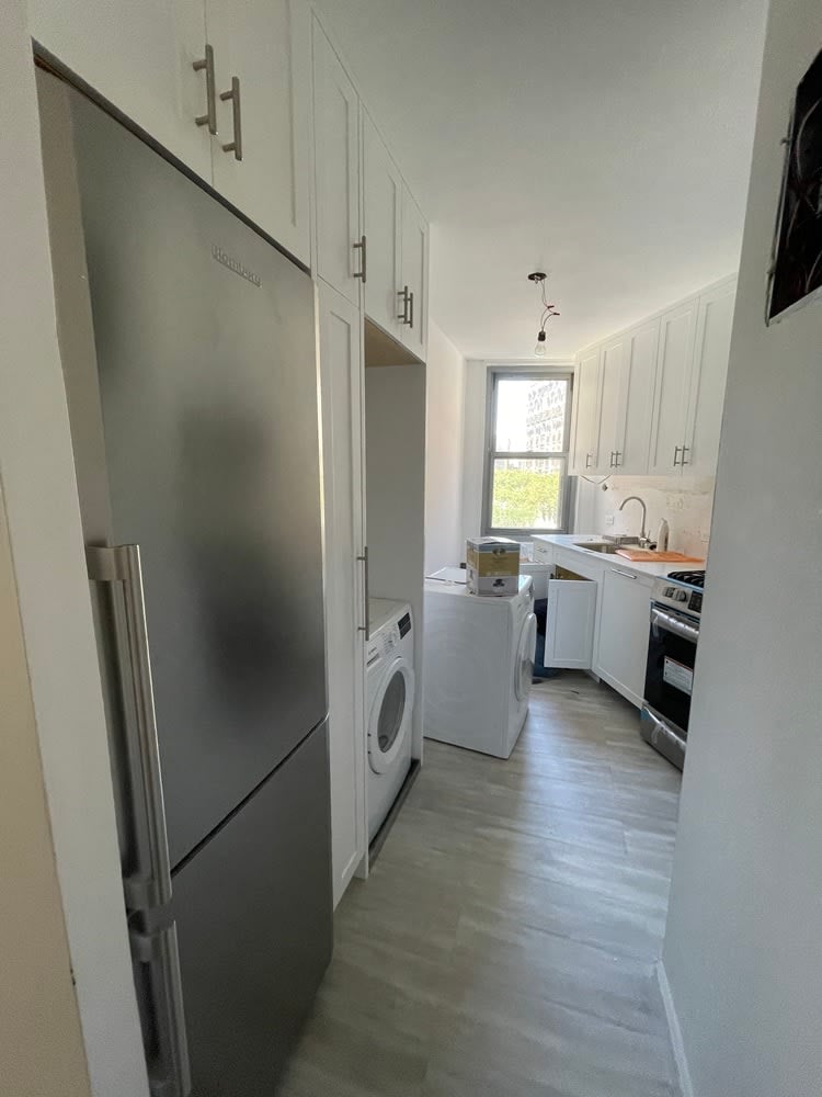 The appliances ordered for installation includes Bosch stacked washer & dryer, Bosch dishwasher, a Frigidaire Gallery Gas Range with matching Frigidaire Gallery over-the-range microwave, and Blomberg refrigerator. Stainless appliances include the gas range, installed over-the-range microwave, and refrigerator, while the dishwasher, washer, and dryer, will be concealed behind cabinetry matching all in the kitchen. Kitchen cabinetry is white "shaker style."